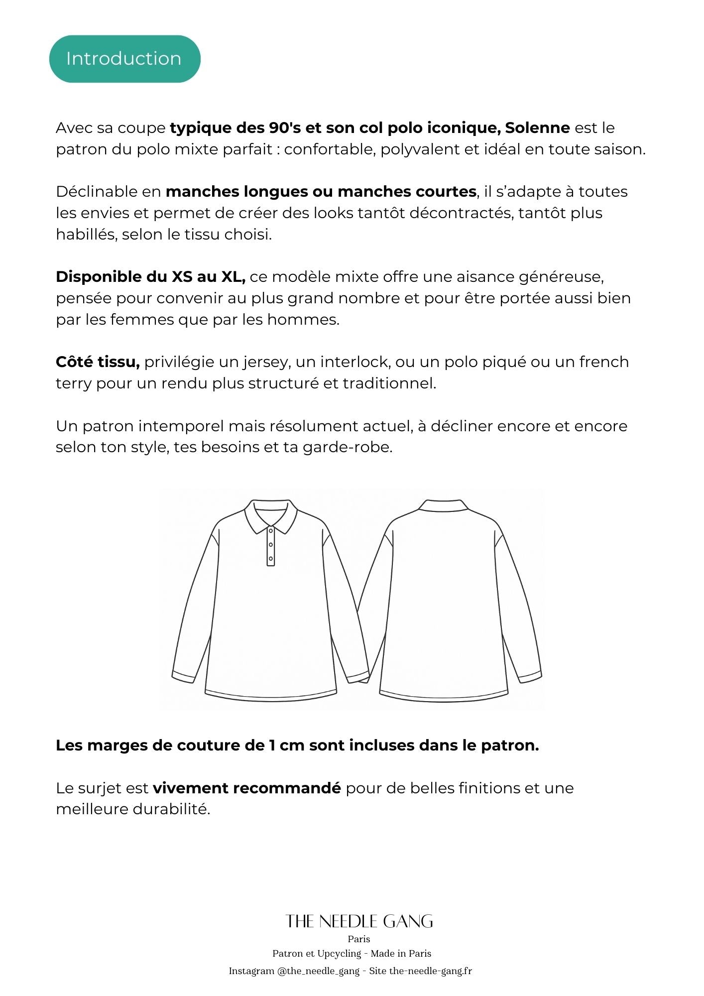 Avec sa coupe typique des 90's et son col polo iconique, Solenne est le patron du polo mixte parfait : confortable, polyvalent et idéal en toute saison.