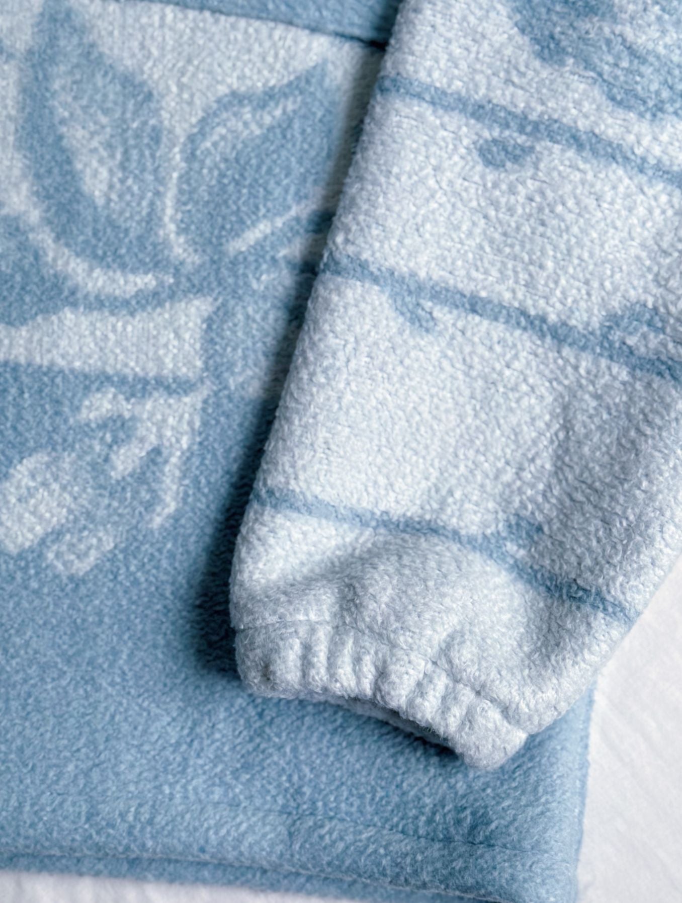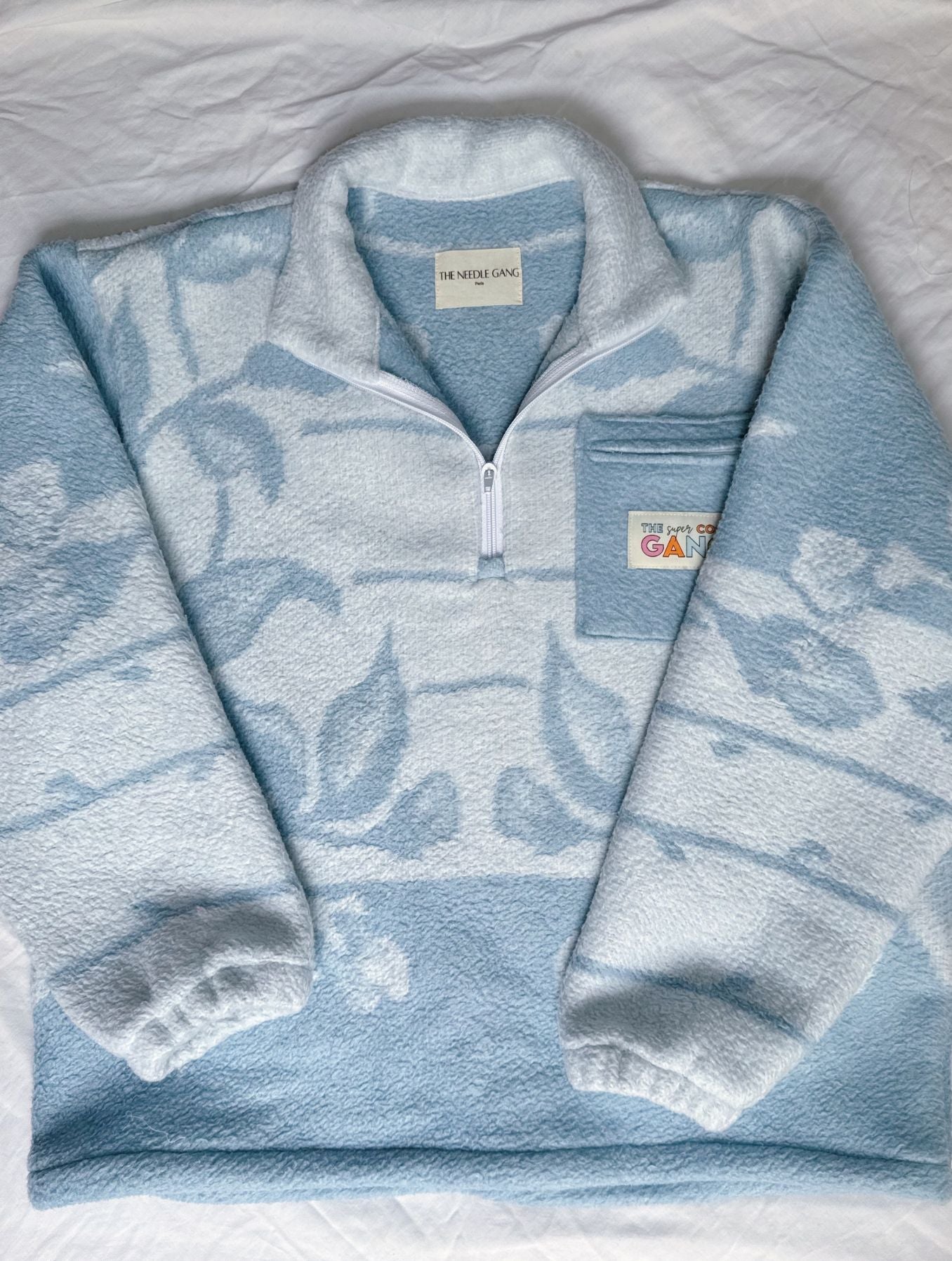 Je l’ai cousue dans une couverture vintage bleu ciel à motif chiné dans un Emmaus en Espagne ☺️