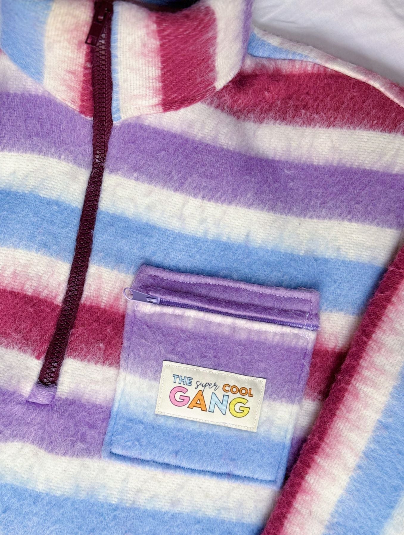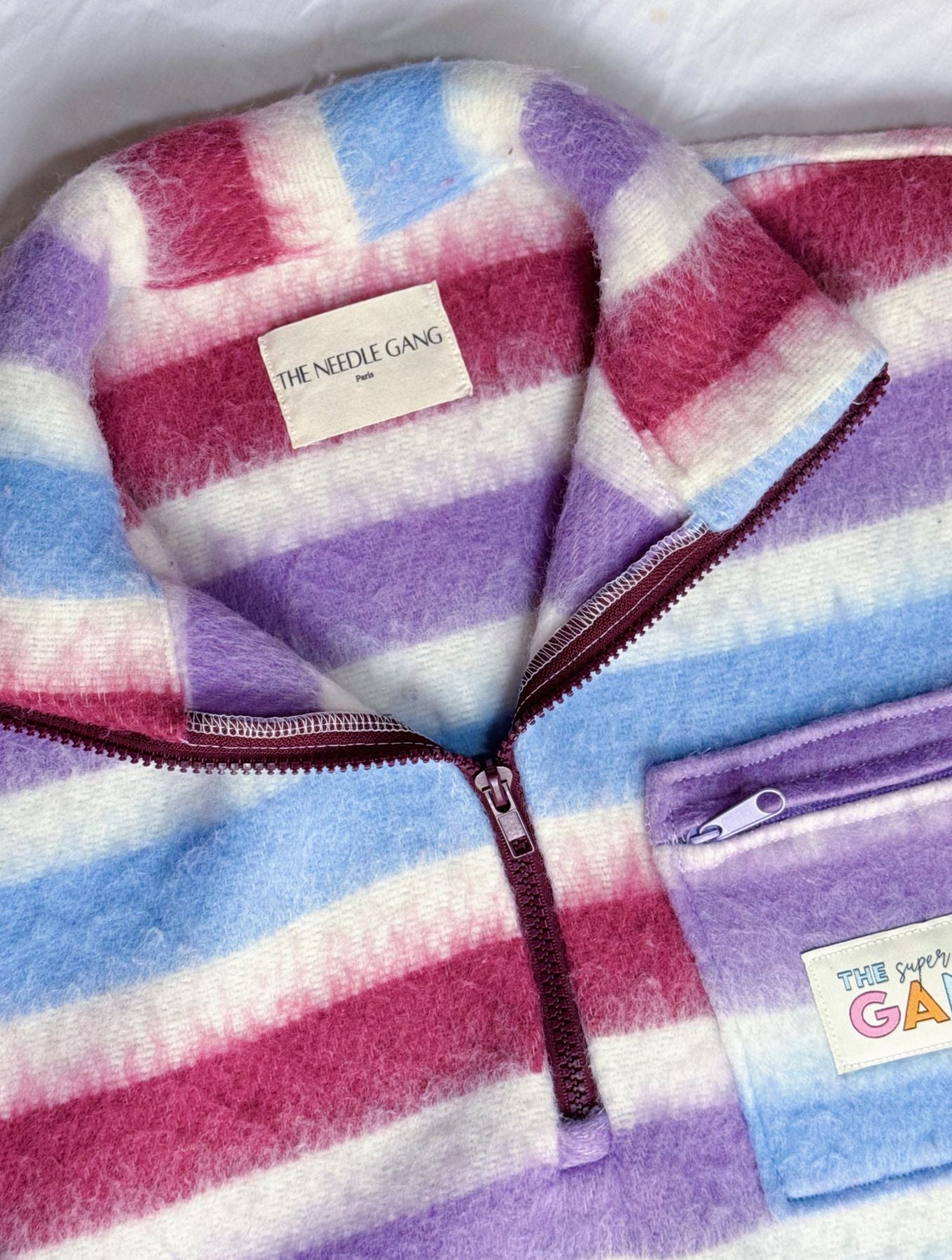 Je l’ai cousue dans une couverture vintage à rayures mauves, bleu ciel et bordeaux en ressourcerie.