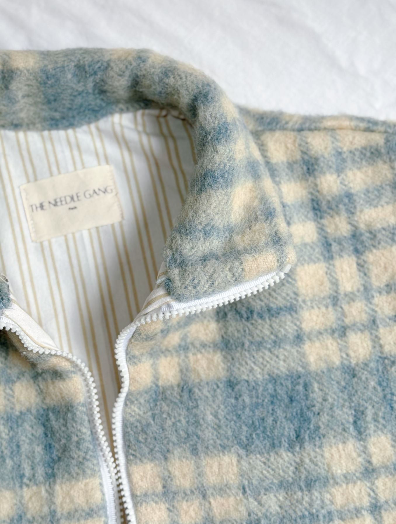 Je l’ai cousue dans une couverture vintage en laine à carreaux beus et crème trouvée en ressourcerie et un drap 100% coton Ikea.